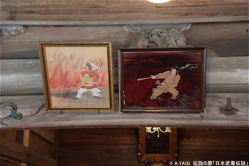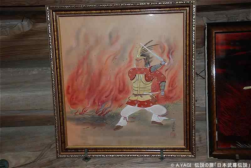 天叢雲剣を手にした日本武尊は尾張から船や陸行で東海を北上し駿河まで行きました。(『古事記』では相武国)ここで首長らの誘いに騙され、火攻めに会ってしまいました。賊らは日本武尊らを焼き殺そうとして野に火をつけたのです。すると、脇にさしていた天叢雲剣がすっと抜け出して草を薙ぎ払い始め、火から身を守ることができました。(『古事記』では倭姫からもらった火打石で向い火をつけ、天叢雲剣で草を刈り払って難を逃れたとしています。)