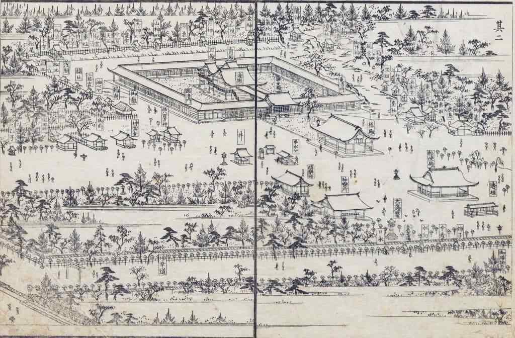 現在の熱田神宮は明治時代に再建されたものですが、江戸時代に書かれた『尾張名所図会』には本殿は塀で囲まれており、その中に正殿と土用殿が並んで立っていることが分かります。