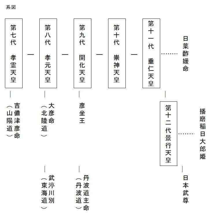 *日本武尊と弟橘姫との間に「稚武彦王(わかたけひこおう)」がいるが別人です。