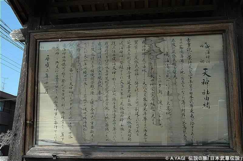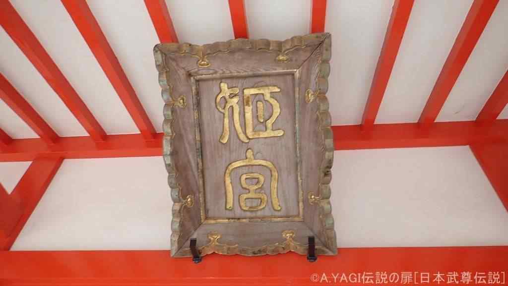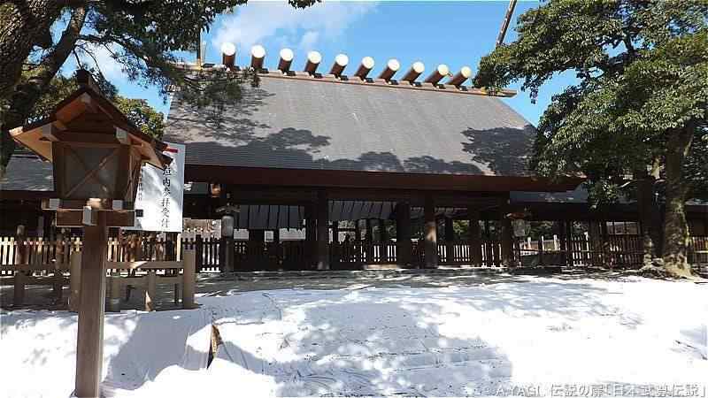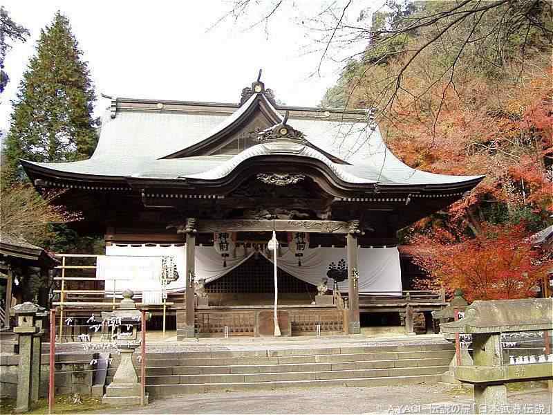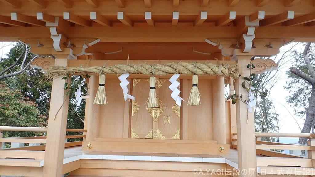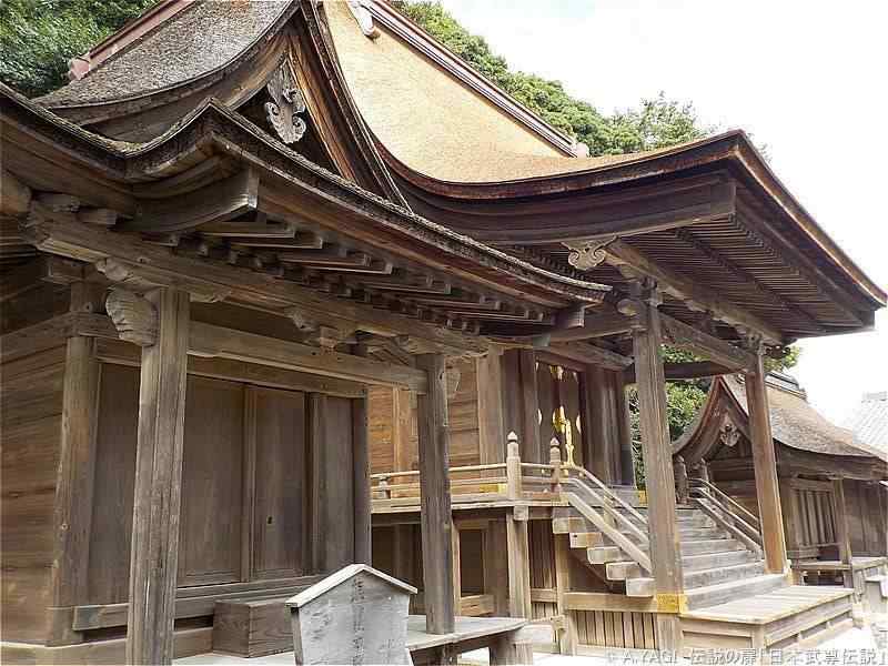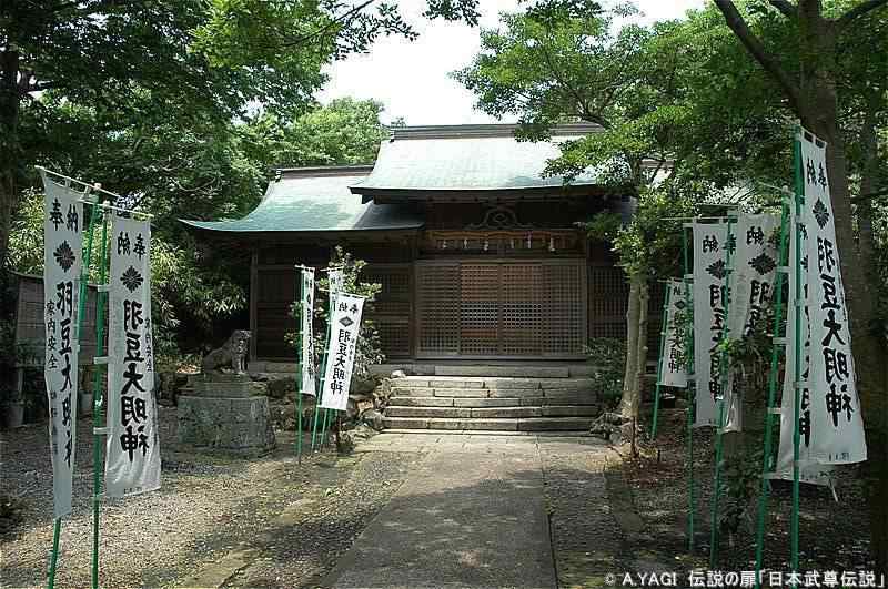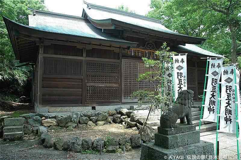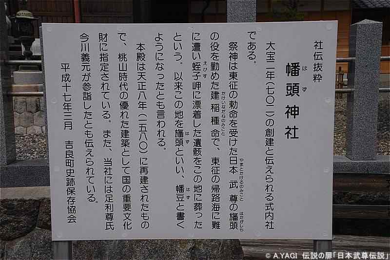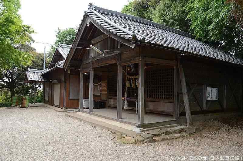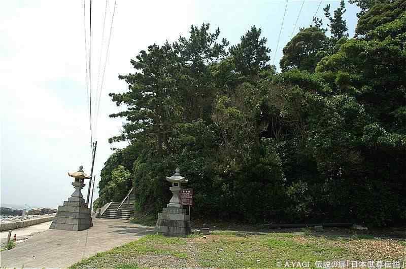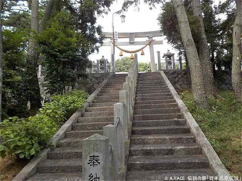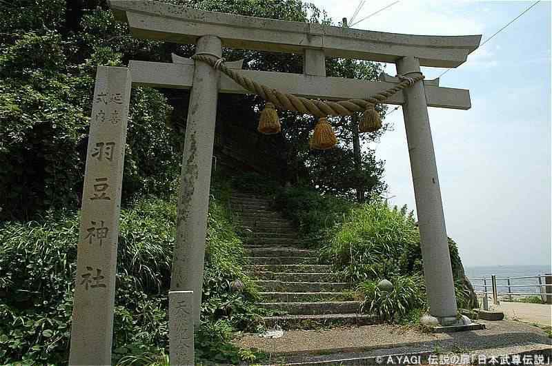 日本武尊の東征に「幡頭」(はたがしら)として従った建稲種命は帰途に伊豆の海で亡くなりました。その後、遺骸が蛭子(えびす)岬(宮崎海岸)に流れ着いたので村人が丘上に祀りました。702年のこと(大宝2年)文武天皇は夢で建稲種命の墓ががあることを告げられました。そこで、勅命により社殿を造営し、矛を納めて御神体としたというのが由緒です。