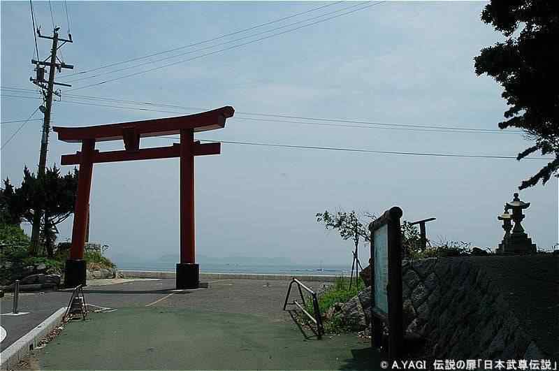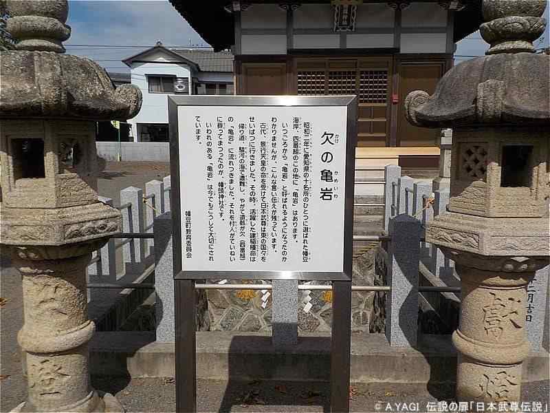 駿河の海で亡くなった建稲種命の遺骸が流れ着いた場所が「亀岩」で、幡頭海岸の4番組とされています。4番組は欠(かけ )と呼ばれたことから、欠の亀岩と呼ばれています。 渥美半島と知多牛島にはさまれた三河湾沿岸の蛭子(ひるこ)岬に鎮座しています。