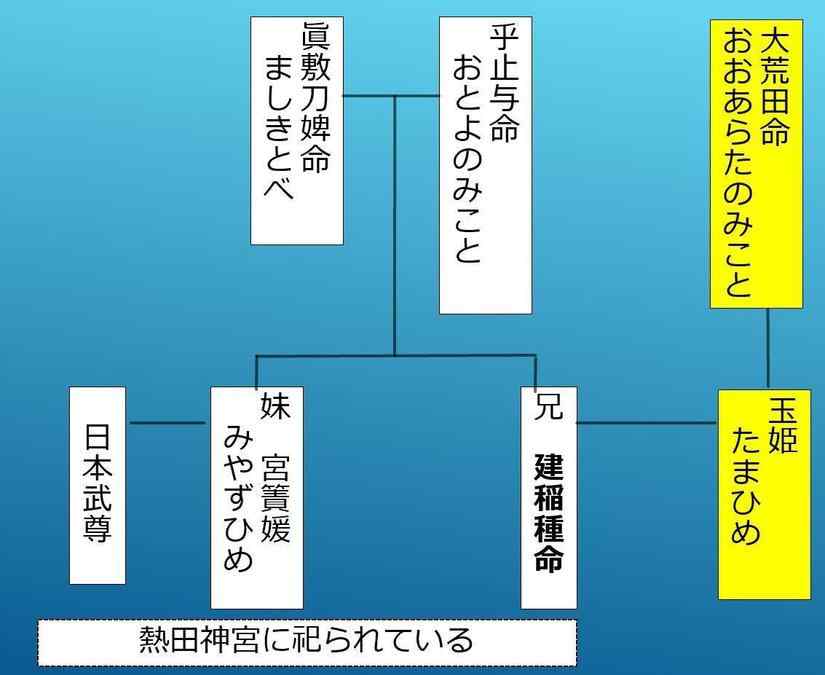建稲種命の妹は日本武尊の妃となる宮簀媛(みやずひめ)です。建稲種命は日本武尊の副将軍として東征に出かけましたが、本隊とは別行動をしていたようです。
