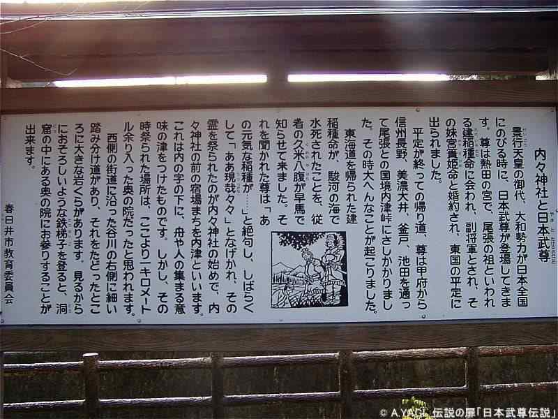 日本武尊がそれを知ったのは、東征後、甲斐、信濃国を過ぎ、尾張に戻ってきたときです。岐阜県と愛知県の県境に内津(うつつ)峠があります。愛知県春日井市の内々(うつつ)神社にこの時の様子が伝わっています。