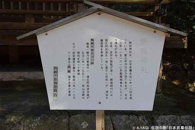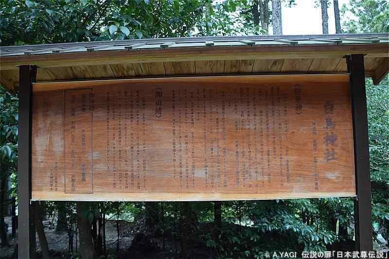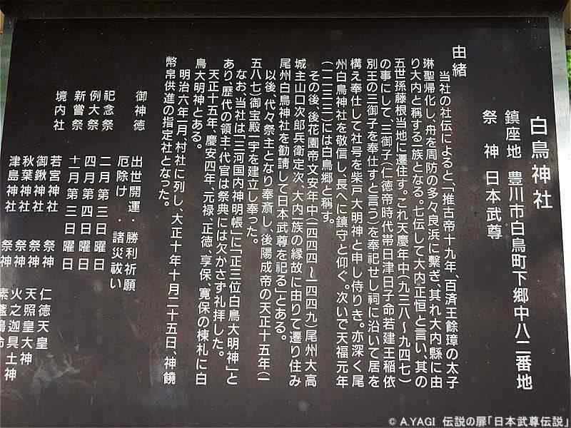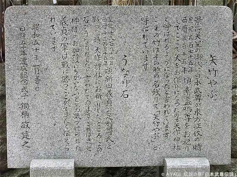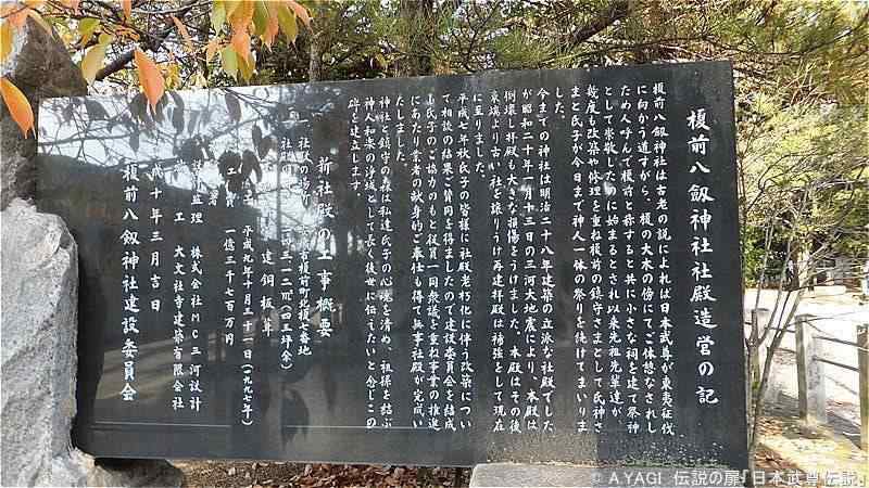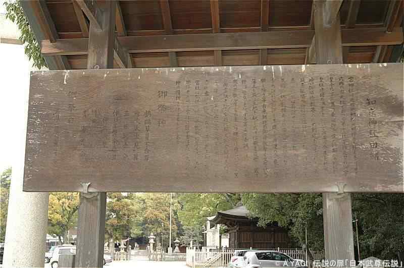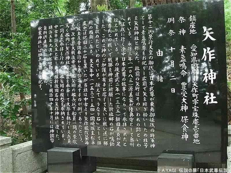 境内の石板には、1083年、源義家が陸奥守として奥州征伐に向かう時、日本武尊の故事にならって矢作神社に参拝したと書かれています。