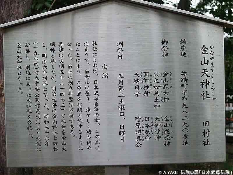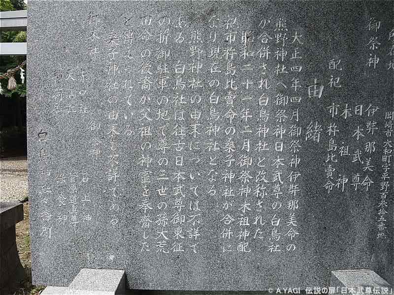 祭神は日本武尊です。地図上の位置から見て通過地なのかもしれませんが伝承は見つかりませんでした。