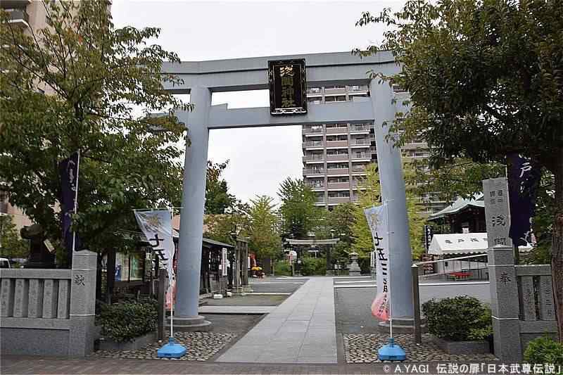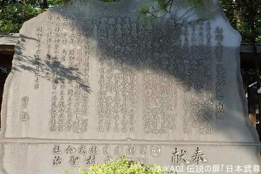 船橋大神宮の境内にあり、日本武尊を祀っています。「船橋の御酉様」と呼ばれて親しまれています。また、この近くの常盤神社も徳川家康、徳川秀忠とともに日本武尊を祭神として祀っています。