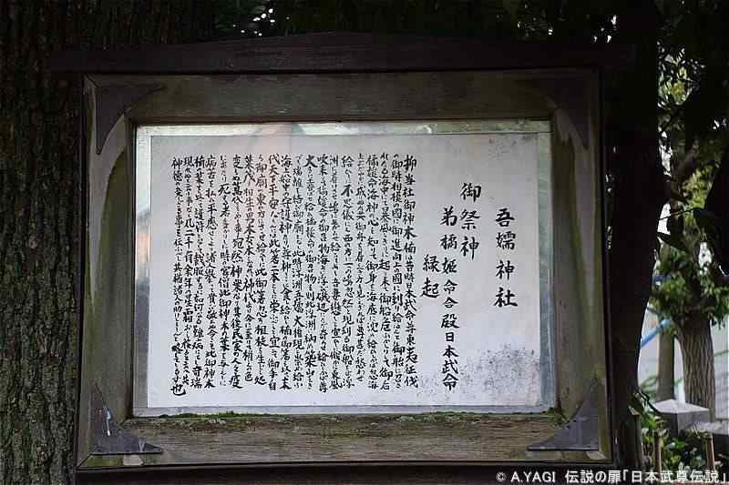景行天皇の時代に創建された古社です。弟橘媛を祭神として祀り、日本武尊が合祀されています。身を投じた弟橘媛の御召物が海上に浮び、海岸に流れ着いたのを見た日本武尊はたいへん喜びました。そこで、築山を築きそれをおさめて陵とし吾嬬大権現として祀りました。日本武尊は食事の際使っていた楠箸2本を御陵の東に刺したところ、箸が根付き、枝が伸びて葉が繁り、男木と女木となったと言われています。境内にも御神木がありますが、樹齢は千年も経っていないと思われます。