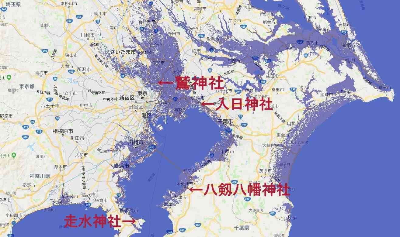 日本武尊の行程として、千葉の入日神社付近を再船出し、足立区島根の鷲神社付近の海岸に上陸したと推測しました。その後、行程順は不明ですが、武蔵国内を回り、奥州の蝦夷を征伐するため上総に向かったと考えました。