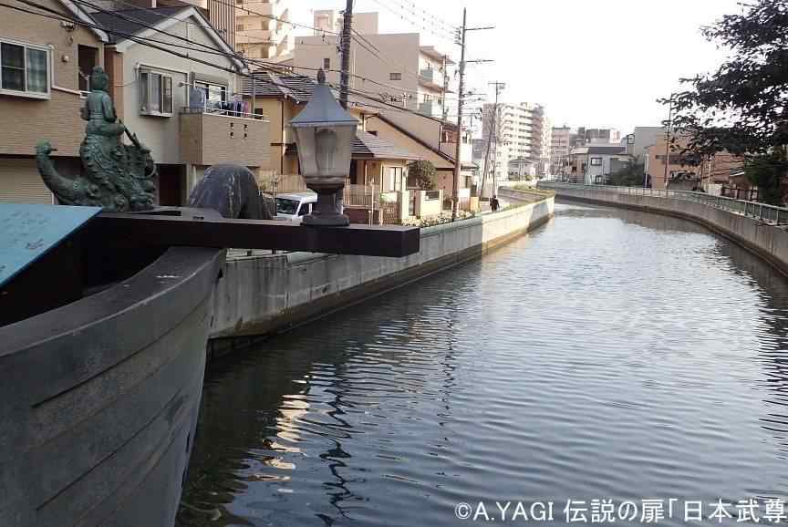 船橋大神宮近くの海老川にかかる橋にあります。説明書きには、古代の英雄(日本武尊とは書かれていません)が海老川を渡ることができなかったため、村人たちが船を並べて橋の代わりとして渡したと伝えられています。