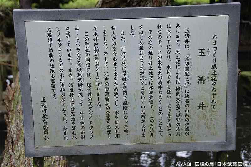 泉の水を手ですくおうとしたところ、身に着けていた曲玉を落としてしまったところ(玉で水を清めたとも)と伝えられています。昔から水が湧き出るところを「永井戸:ながいど」と称していたことが案内に書かれていました。