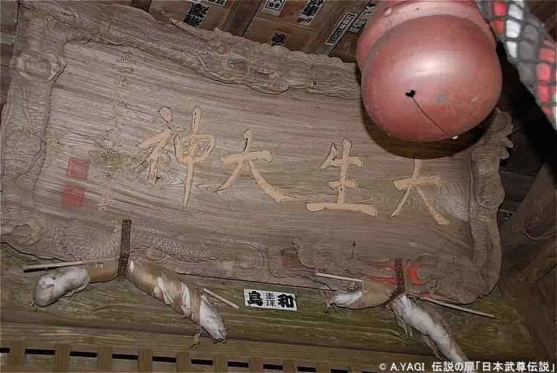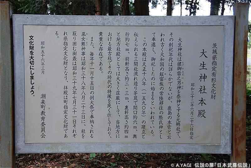 昔、倭武天皇が相鹿の丘前(おかさき)の宮においでになったときに、膳炊屋舎(おほひどの 炊事場)を海辺に建て、小舟を並べてつなぎ橋にして行宮(あんぐう)に通われました。そのため、大炊(おおい)から大生(おおふ:おおう)と名付けました。また、倭武天皇の后の大橘比売命(おおたちばなひめのみこと)が、大和からお越しになって、この地で天皇にお会いになったことから、安布賀(あうか)または遇鹿(あふか)の村といいます。