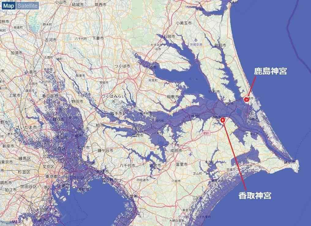 上の地図を見ると分かりますが、古代の霞ケ浦は北浦とつながっていました。これより北は蝦夷の地で、これを監視をするかのように鹿島神宮、香取神宮が対面して建っています。(現在は利根川をはさんでいます) 二社の祭神は武甕槌大神(たけみかづちのおおかみ)別名鹿島神と経津主神(ふつぬしのかみ)別名香取神で共に軍神です。この二神が蝦夷ににらみを利かせているのです。