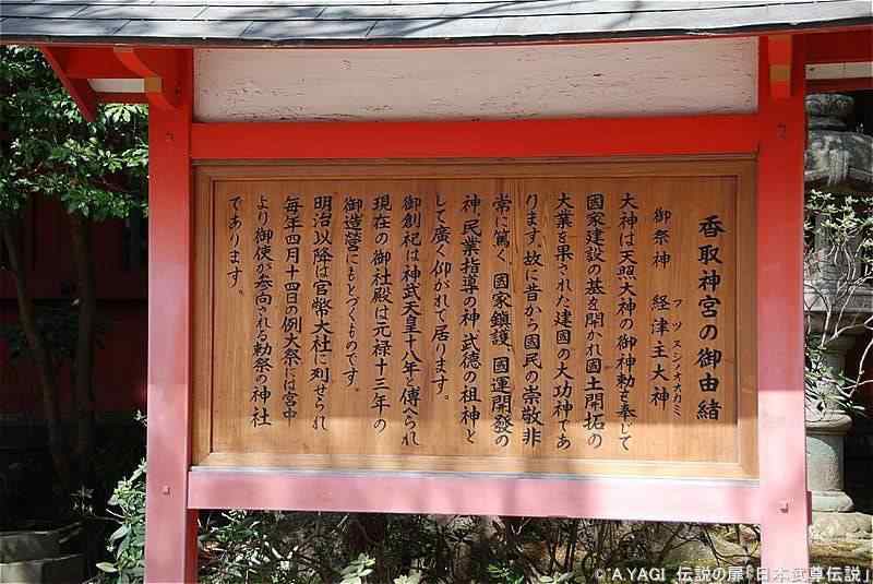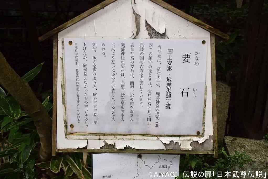 「古伝によればその昔、香取・鹿島の二柱の大神は天照大神の大命を受け、芦原の中つ国を平定し、香取ヶ浦付近に至った。しかし、この地方はなおただよえる国であり、地震が頻発し、人々はいたく恐れていた。これは地中に大きな鯰魚(なまず)が住みつき、荒れさわいでいると言われていた。大神たちは地中に深く石棒をさし込み、鯰魚の頭尾を押さえ地震を鎮めたと伝わっている。略」