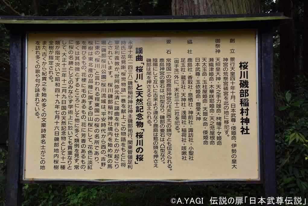 日本武尊東征の折、常陸の桜川で皇大神宮を遥拝して祀りました。境内には要石があります。この石は縄文時代より住民の信仰の対象となっているようです。一説によるとこの地はかつて鹿島の神領であって、 鹿島神宮の戌亥(西北)の鎮守とされています。鹿島神宮要石は凹型で、鹿島の要石は鯰(なまず)の頭を押さえ、礒部の要石は凸型で、鯰の尾を押さえる(地震がおこらない)と言われています。