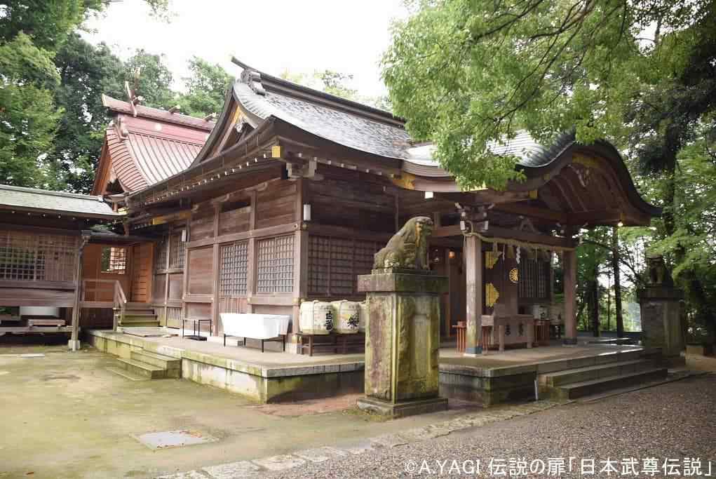 祭神として別雷命(わけいかずちのみこと)を祀っています。『常陸国風土記』には倭武天皇が相鹿(あうか)の丘前(おかさき)の宮にいた時、浦浜に膳炊屋舎(おおいとの)を建て橋を造って行き来したと書かれています。この膳炊屋舎で倭武天皇の食事を作っていた時、雷鳴が鳴り別雷命が椿の大樹に降りてきました。別雷命が村人に声をかけたのを喜び社殿を建立しました。社殿傍の祠は丘前宮と呼ばれていました。その後、丘前宮道鏡大明神としました。