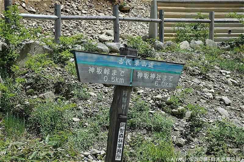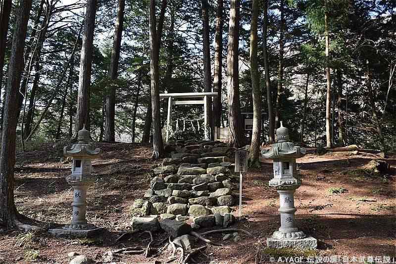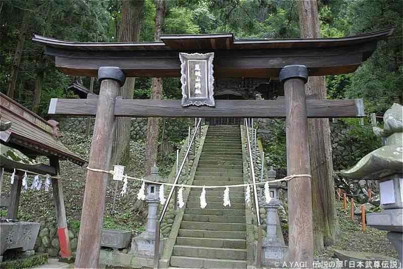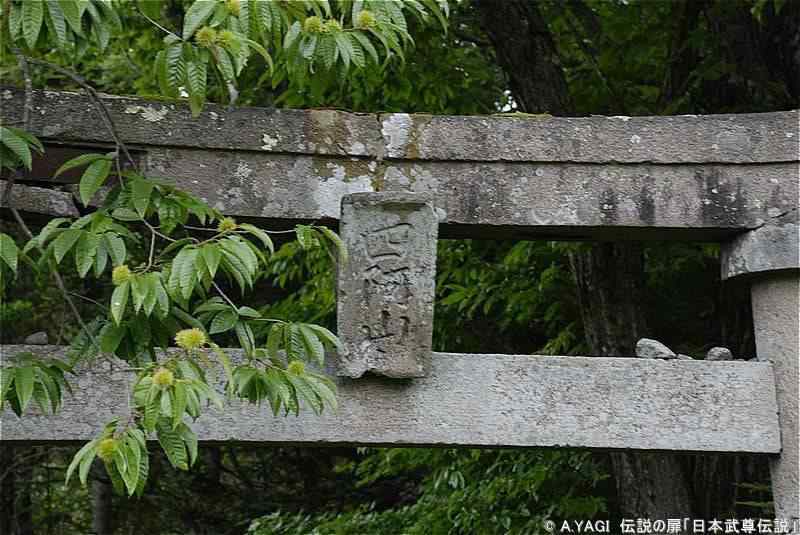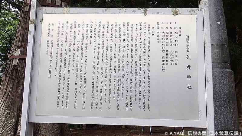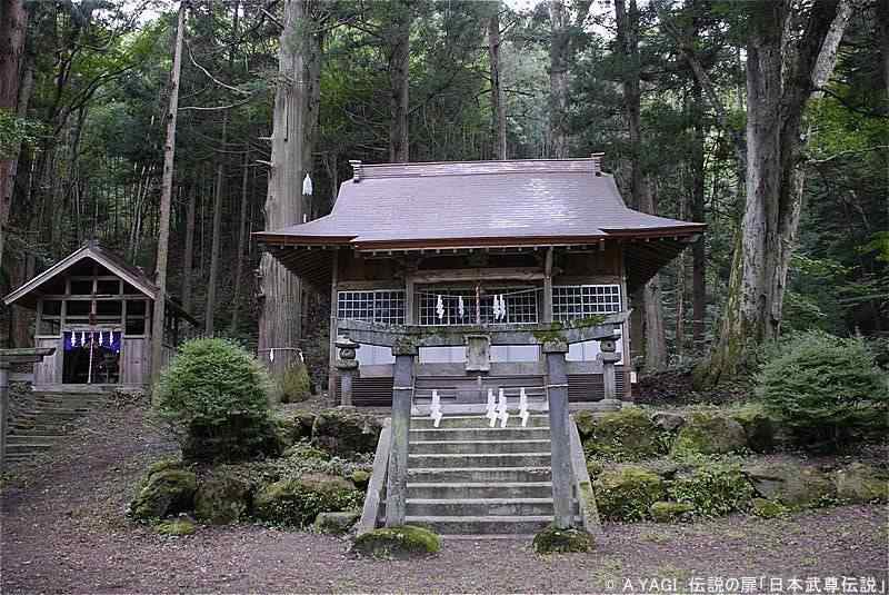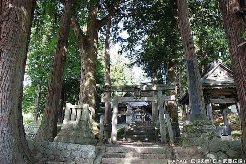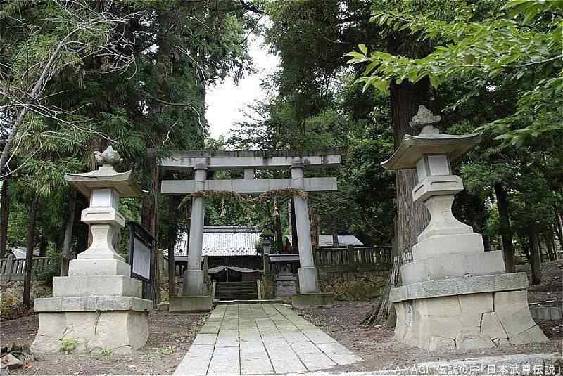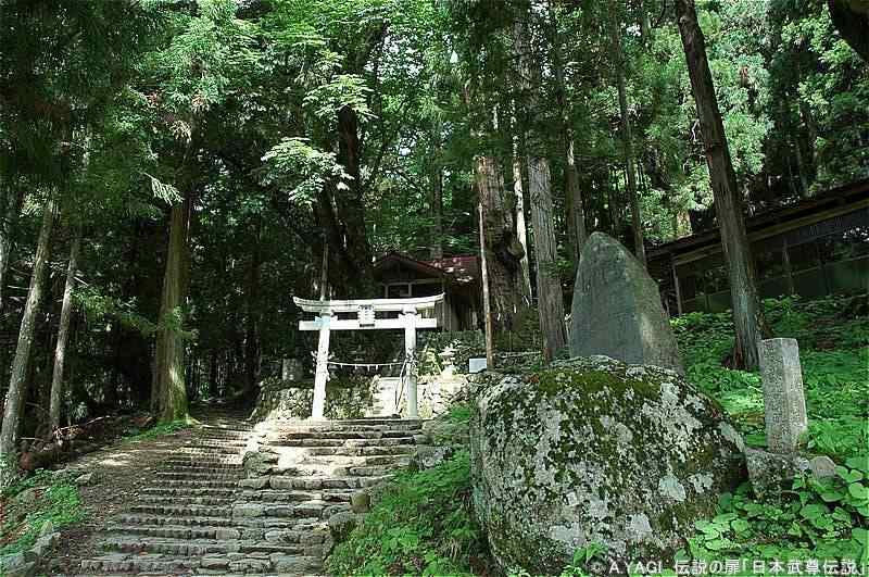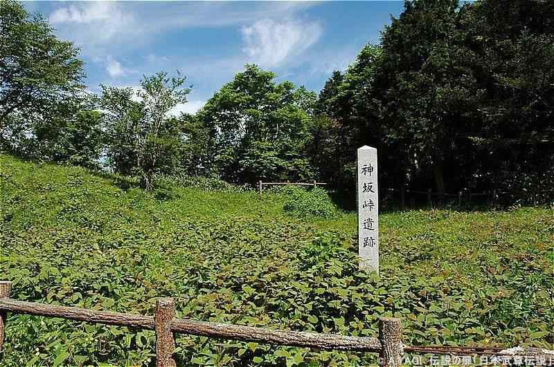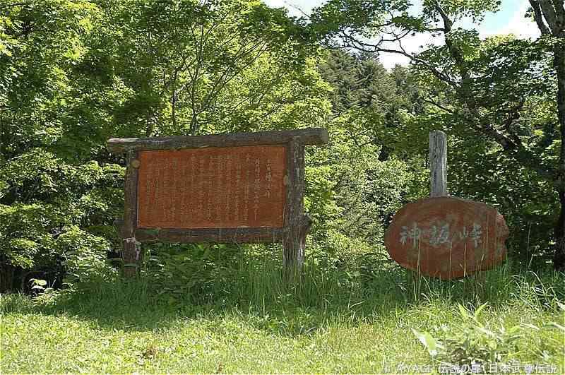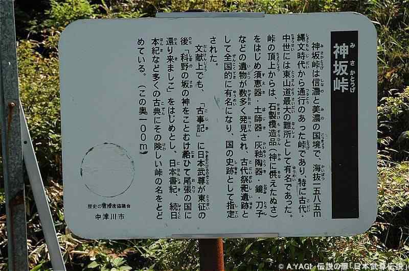 ここも阿智神社と同様に、山中で道に迷っていた日本武尊の前に白い狛(いぬ:犬)が現れて道案内をしたので無事に美濃に出ることができたという伝承があります。それまで信濃坂を越える者は、神の毒気により病になってしまいましたが、この後は、山を越えるとき、蒜を噛んで体や牛馬に塗ると毒気にあたらなくなったと言われています。この信濃坂は神坂峠のこととしています。