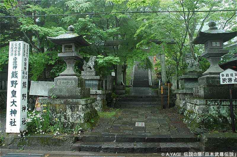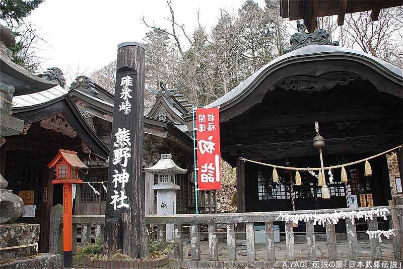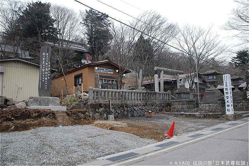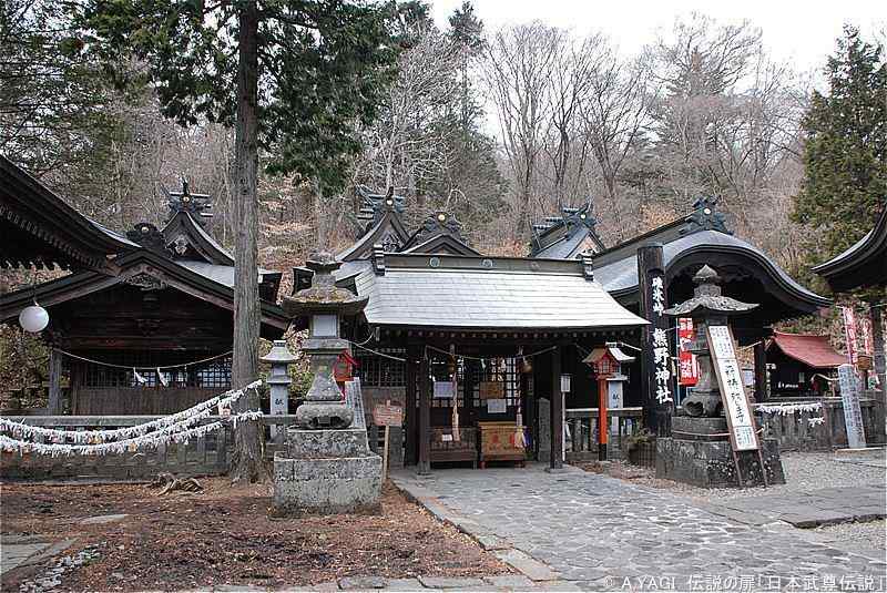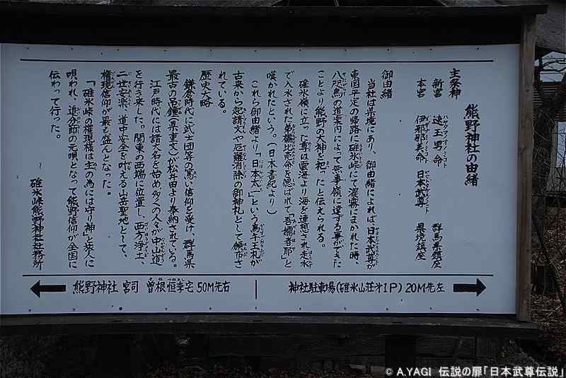 日本武尊は東征からの帰路に濃霧のため道に迷ってしまいました。その時八咫烏(やたがらす)が現れ、道案内をしました。そのお陰で無事に碓日坂(碓氷峠?)に着きました。日本武尊は八咫烏が現れたのは熊野の神のご加護によるものと考え、熊野三社を祀ったのが峠にある熊野神社と熊野皇大神社の始まりです。これは『日本書紀』には書かれていないことです。