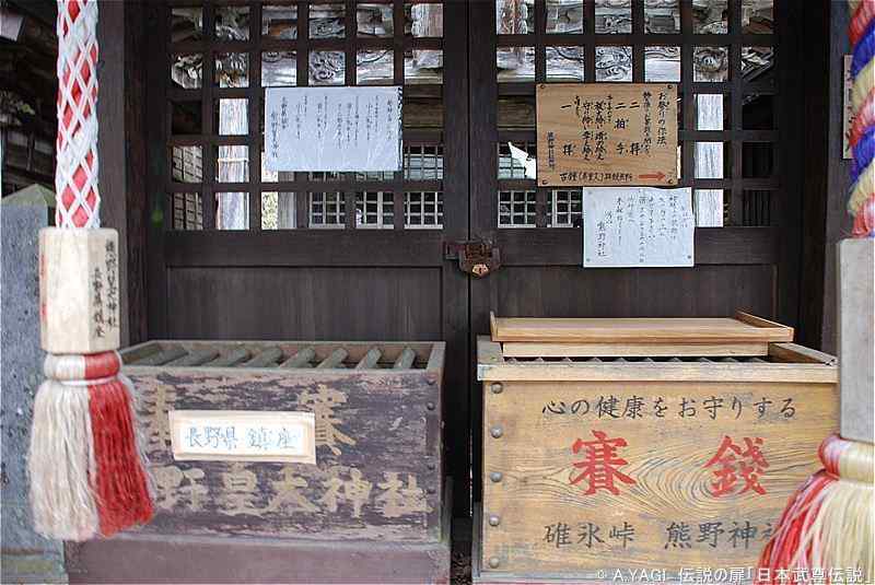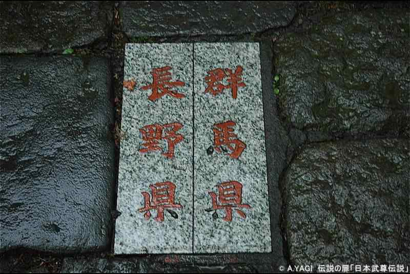 旧碓氷峠には熊野神社と熊野皇大神社があります。管轄する県が違うため、宗教法人も二つあり、群馬県熊野神社と長野県熊野皇大神社とに分かれています。そのため、写真のように両神社に通じる参道に長野県と群馬県の県境を示す石板がはめ込まれています。また、本殿前には二つの賽銭箱が並んで置かれていますが、上方に県境の小さな表示板が取り付けられています。