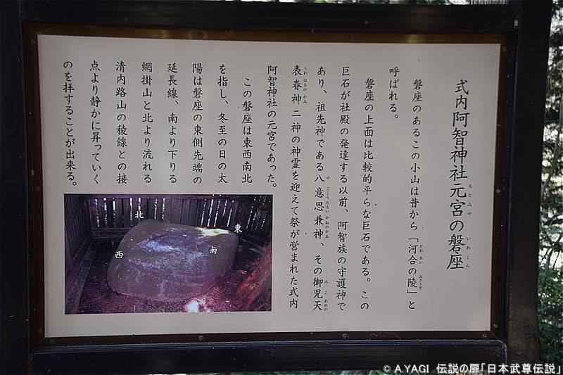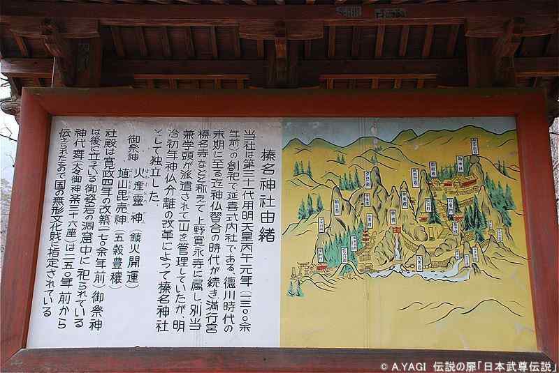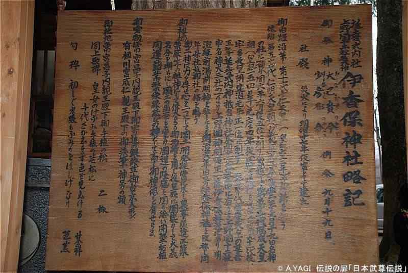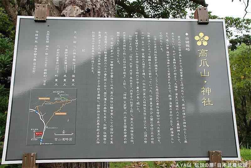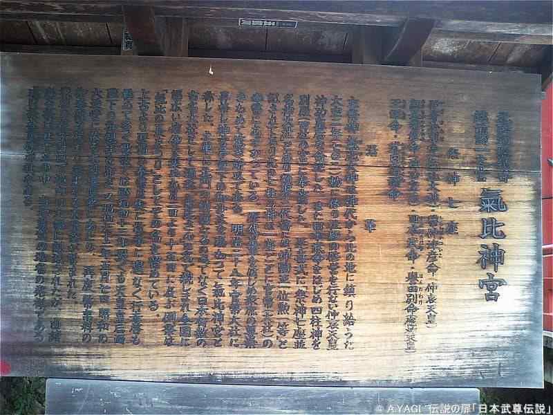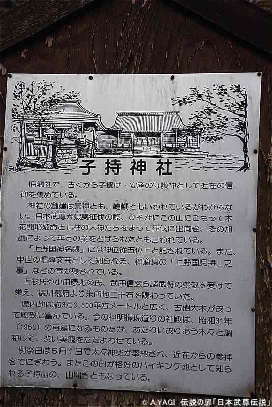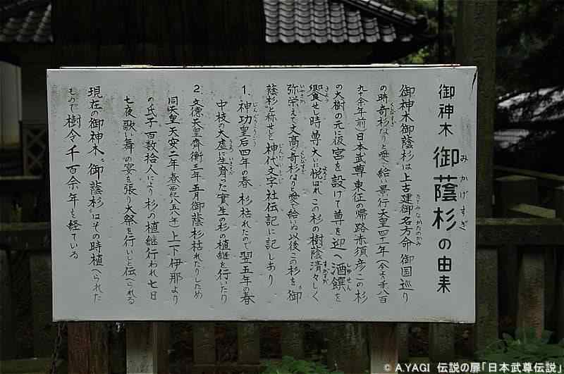 境内の案内板によると、日本武尊が東征の際、密かにこの山にこもって木花開夜姫命と七柱の大神を祀って征伐に出かけたところ、その加護によって平定することができたと書かれています。