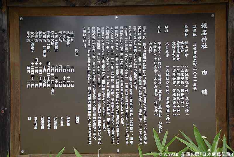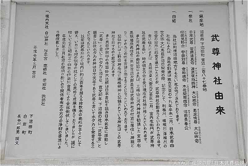 日本武尊の伝承はない神社で、創建は推古天皇の時代です。その後沼田地方の開拓に際しここに石祠を祀りました。また、『日本書紀』の記述に感銘を受けた領主が日本武尊を祀り武尊を「ほたか」と読んだと言われています。