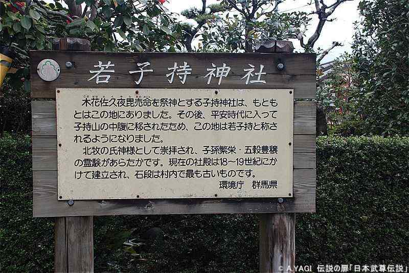 また、この地を訪れた時、豊城入彦(とよきいりひこ)命の娘上妻媛(かづまひめのみこと)を妻とし、子持山に木花開夜姫命を勧進し子が授かることを祈ったところ、媛は無事岩鼓王(いわつづみおう)を産んだ と伝わっています。