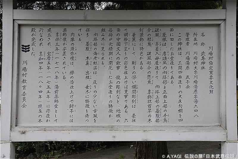 境内にある案内板によると、通称は、和利宮(わりのみや)で和流宮とも称していました。創建年代や神社名の由来は不明ですが、もとは現社地の西南300mほどの御洗水山頂にありました。現社の鎮座地は遥拝所としていましたが、参拝者のために本殿をここに遷座させたと書かれています。日本武尊に関することは特に書かれていませんが、国道145号(日本ロマンチック街道)沿いにあり、通過地ではないかと思われます。
