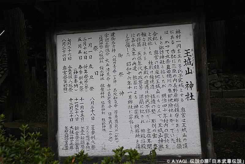 もとは諏訪神社と称していましたが、奥宮が王城山(おうじょうさん)の頂上にあることから、村内の神社を合祀して現在の名前にしたことが案内板に書かれていました。