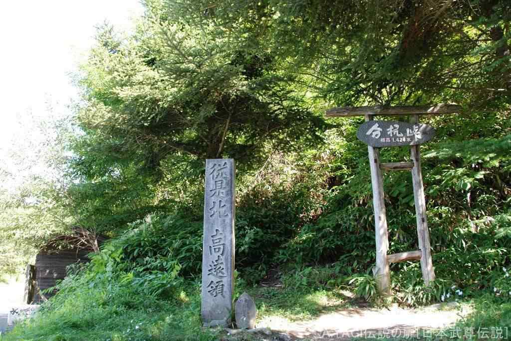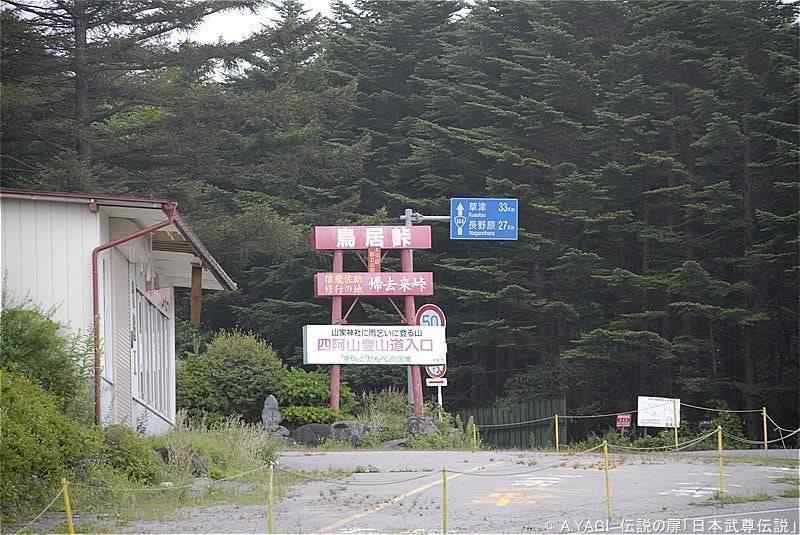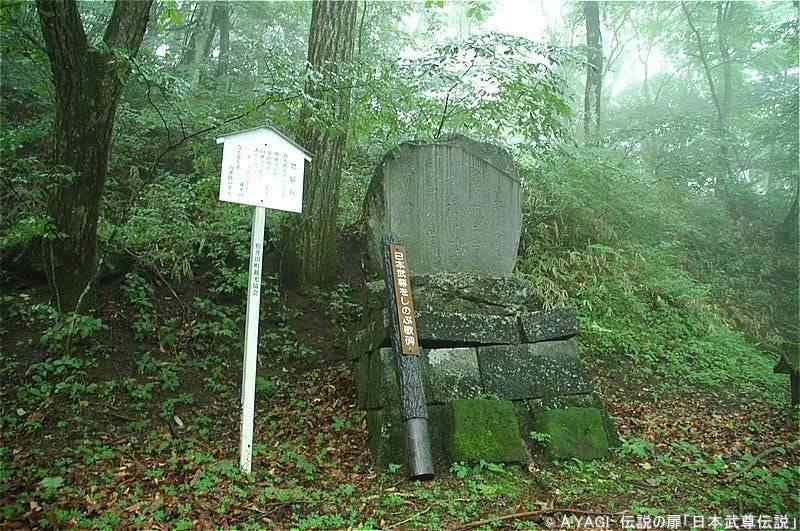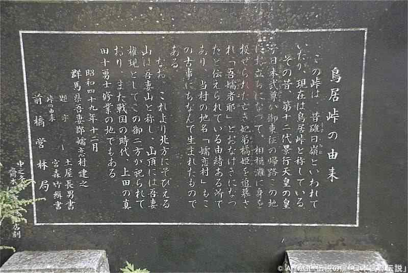 標高1362m、四阿山(吾妻山:あづまやま)登山道に向かう山道と国道144号が交差するところに鳥居峠があります。案内によれば、ここが日本武尊と関係の深い「碓日嶺」で、ここで弟橘媛を偲び「吾嬬者耶麻(わがつまはや)」と嘆いたと伝えられています。つまり『日本書紀』にある「碓日坂」は「碓日嶺」であり、昔そう呼んでいた現在の鳥居峠のこととしています。『天翔ける白鳥』小椋一葉著でも「鳥居峠は碓日嶺」と論じています。