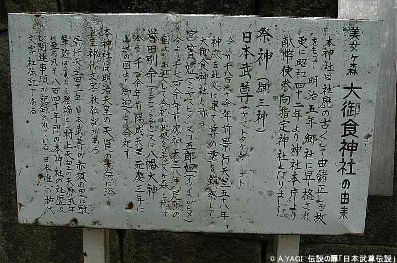 主祭神は日本武尊、他に天照皇大神(あまてらすすめおおかみ)豊宇気姫神(とようけびめのかみ)でを祀っています。