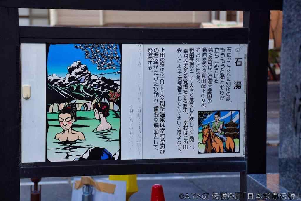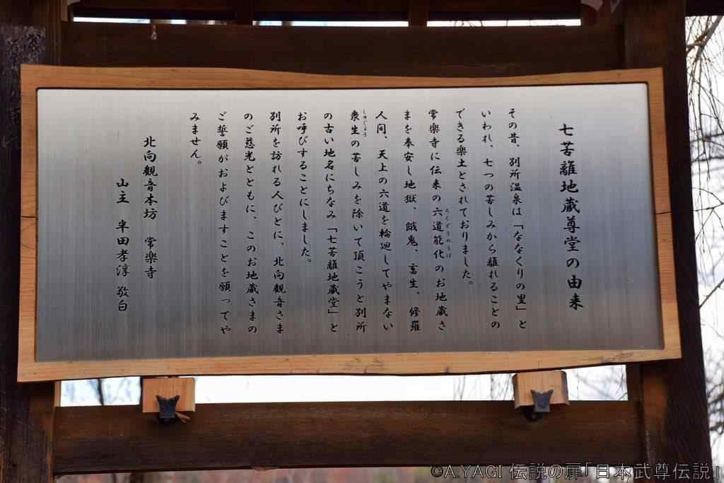 日本武尊は東征の帰路この地で温泉を見つけたと言われており、別所温泉がある里は昔七苦離(ななくり)の里と呼ばれていました。これは日本武尊が霧が立ち込める山中で翁と出会ったことに始まります。その翁がこの地に七つの湯が湧き出るところがあり、これは人の七つの苦を助けるであろうと申しました。そこで山中を探すと七つの湧き湯が見つかり、兵らの体を癒すことができたと言われています。この故事により、ここは七つの苦難(今の苦しみ)から離れられる楽土とされていました。温泉地入り口の駐車場の前にある七苦離地蔵尊堂にもその名がつけられています。この地蔵尊堂の案内板にそのいわれが書かれていました。別所温泉は弱アルカリ泉・単純硫黄泉で、独特の臭いがありますが、その効能がよく、大師の湯、石湯、大湯など風情のある温泉場があります。特に石湯は若き真田幸村の隠しの湯とも言われています。