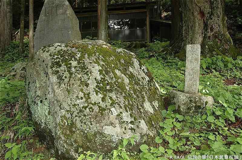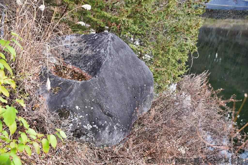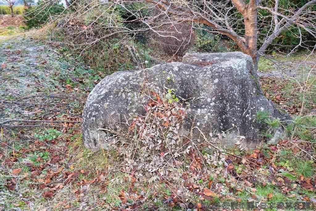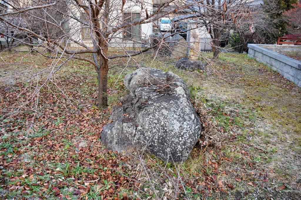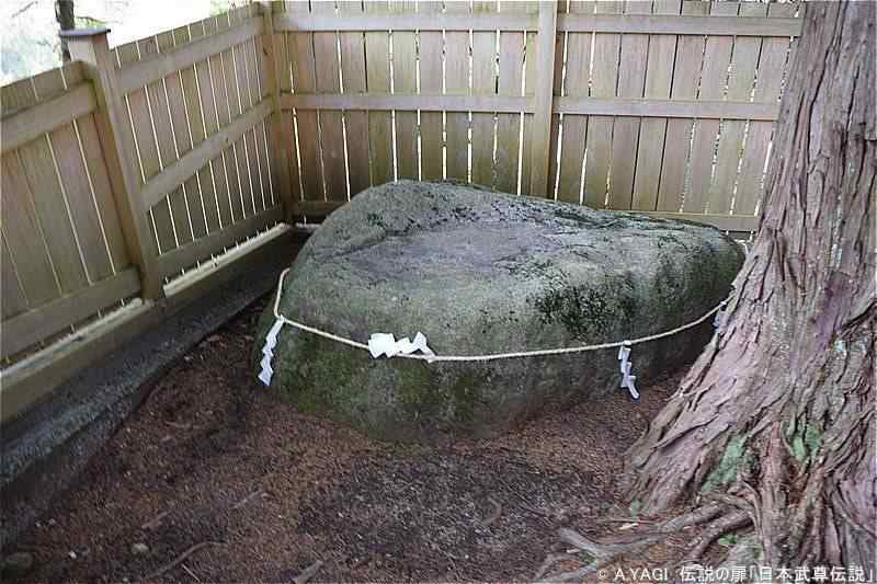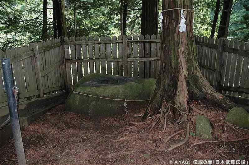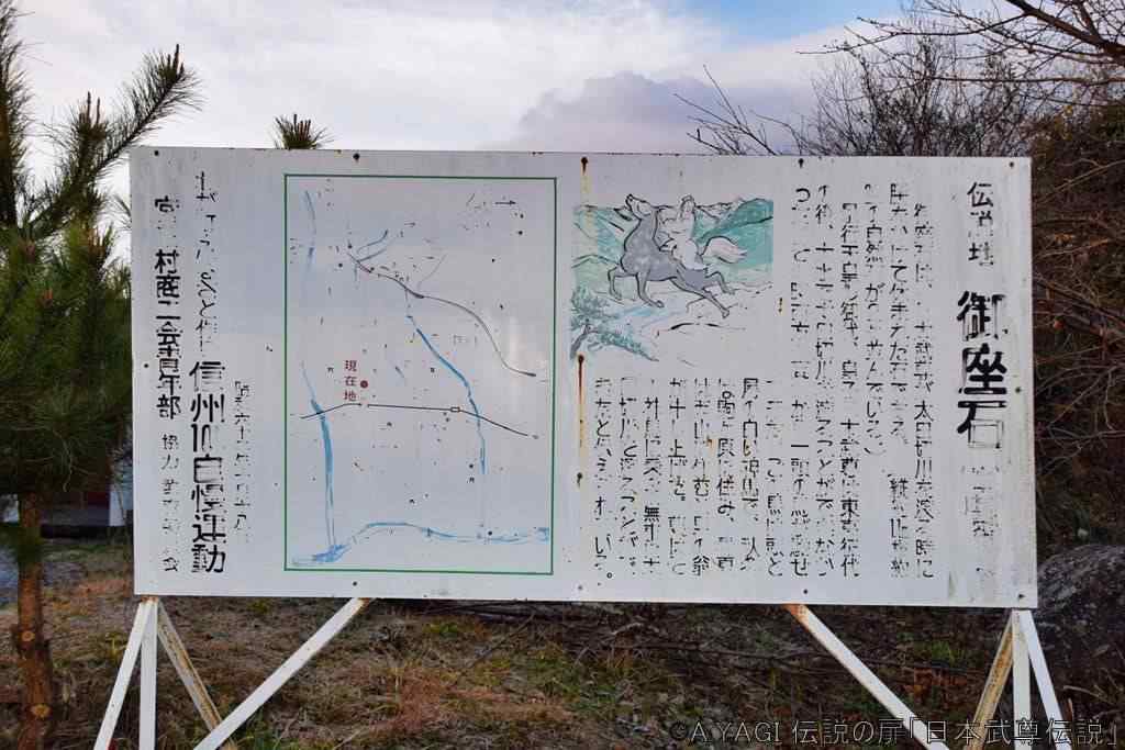 日本武尊は太田切川を渡ろうとしましたが大水で水かさが増えて渡ることができませんでした。そこでこの石に座って休んでいると、西方から頭と尾が白い馬が現れました。里の翁が「この馬は秋冬は駒が原に住み、春夏は天山に住んでいる神馬です」と言いました。馬の背に乗った日本武尊は無事に川を渡ることができました。 (御座石案内板)