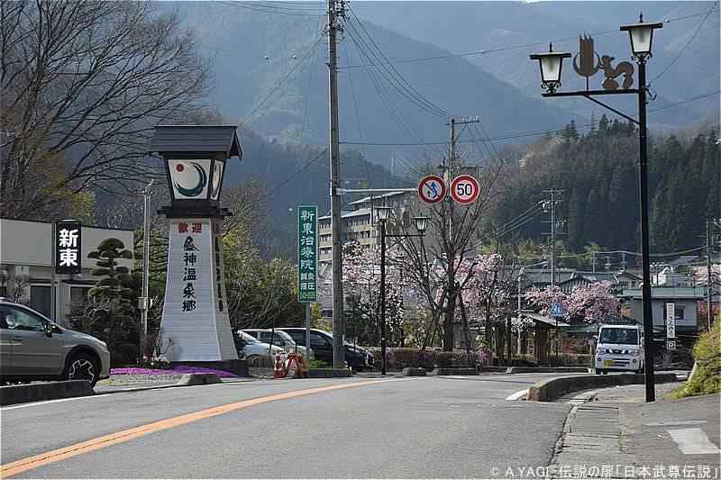 温泉の名の昼神は日本武尊の故事にちなみ「蒜噛」の音を漢字を変えて表したものです。