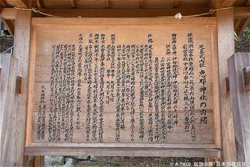 日本武尊が東征の帰路、恵那山に登って恵那大神を拝んだと言われています。