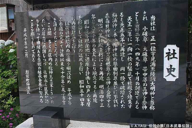 さらに、日本武尊からの報告がないことを心配した景行天皇が大碓尊を遣わし、この地で再会し戦勝を祝ったとされています。(福井県神社庁による)