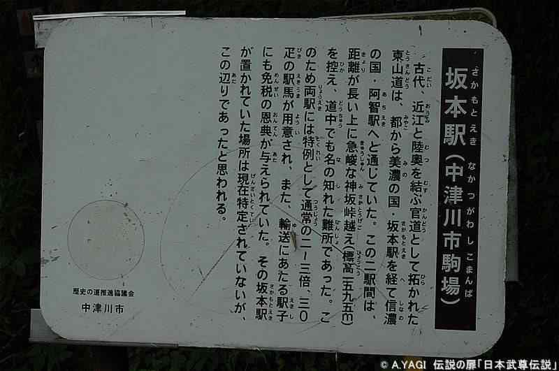 古代坂本駅があった場所は特定されていません。中津川市駒場(こまんば)には碑が建っています。坂を上り西に向かうと中山道の中津川宿に着きます。