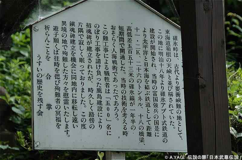 「碓氷峠は、古代より要衝嶮難の地として東海道箱根の天嶮と並び称されていた。この地に明治十八年より碓氷アプト式鉄道の建設が開始され、当時の富国強兵の国是により太平洋と日本海を結ぶ鉄道として距離十一.二k、二十六のトンネル、十八の橋梁、高低差五百五十三米の碓氷線が一年半の短期問で開通した。当時の技術を考えるときおそらく人海戦術であったであろう。(略)」
