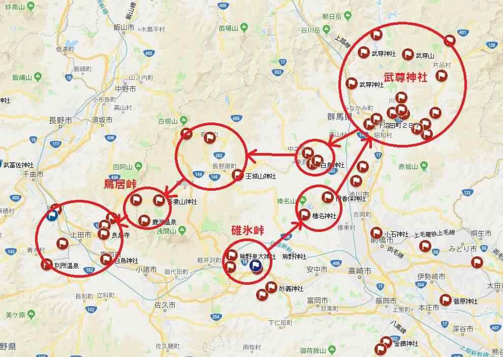 よく調べてみると、武尊山までの行程で日本武尊の足跡はそんなに多くないことがわかりました。まず子持神社がある群馬県渋川市に見られます。次に武尊山周辺には日本武尊を祀る神社が多くありますが、後の時代に武尊山と関係して村々で祀ったと思われ、足跡は見つかりません。武尊山の西に位置する宝川温泉には白鷹の湯の伝説があり日本武尊の足跡が見られます。確かな伝承がある場所をつないだ線上にある神社等は通過地と考えました。
