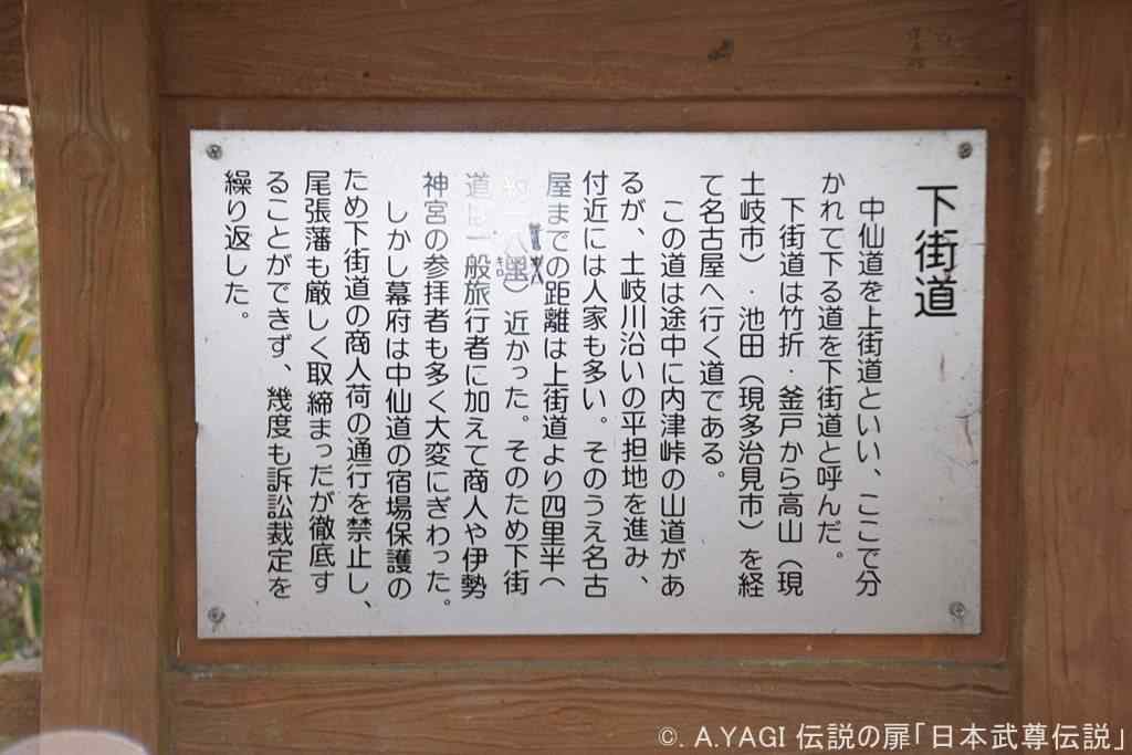 江戸時代、中山道(東山道)から離れ、尾張城下に向かう脇街道は木曽街道とも呼ばれた上(うわ)街道と善光寺道とも呼ばれた下(した)街道の2本ありました。上街道は現在の愛知県道102号(旧国道41号)で、参勤交代で尾張藩主が中山道を利用する際の重要な官道であったのに対し、下街道は現在の愛知県道508号(一部国道19号・旧国道19号)で、庶民の道として利用され、伊勢参り、御岳山や善光寺参りをはじめ、峠越えの少ない道として多くの利用者がありました。これらの街道は古代から利用されていた道が整備されたものです。古代の美濃と尾張を結ぶ道は後の下街道で、道沿いに日本武尊関連の地名や史跡を見ることができます。