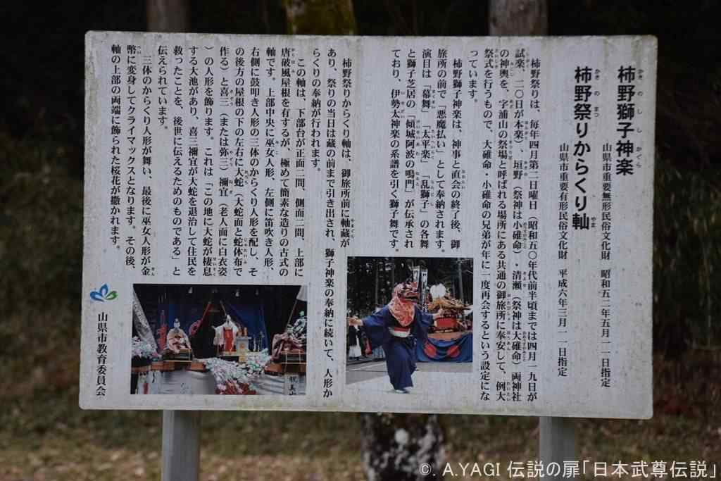 この神社に関して、産経新聞取材班が平成29年発刊の『日本人なら知っておきたい英雄 ヤマトタケル』の中で、日本武尊が東国平定の帰路に美濃に着いたとき、都からの命令を待つ間、大碓命と睦まじく住んでいたと書かれています。私は柿野に3回出かけ、地元の方に尋ねましたが、この伝承を確認することはできませんでした。もしこの伝承が正しければ、随分遠回りしたことになります。