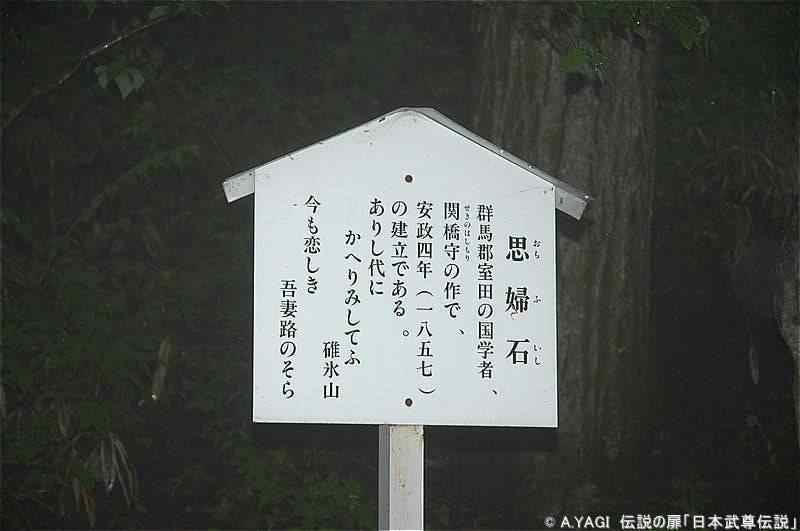 旧中山道の碓氷峠付近を散策しました。峠にほど近い道の端には「日本武尊をしのぶ歌碑」がありました。これは「思婦石(おもふいし)」といいます。この石の説明には、
