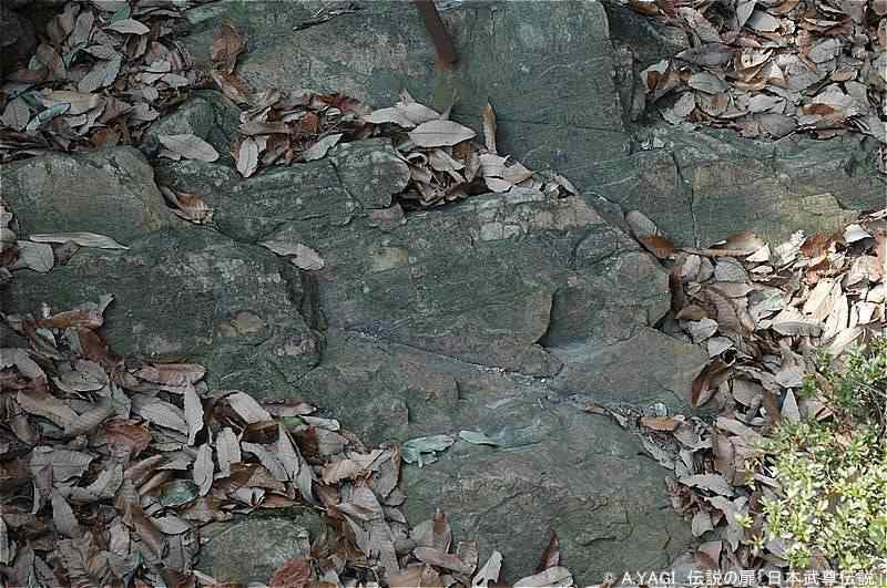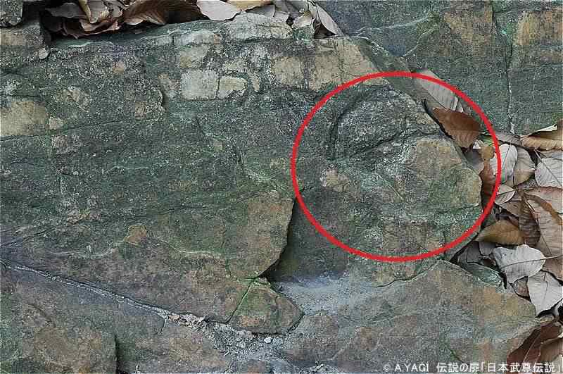 しばらく立ち止まって建稲種命を祀った内津の方を振り返って見ていたら岩に馬の蹄のあとがつきました。岩に小さなくぼみがついていますので、それが蹄の跡とされました。(赤い円)